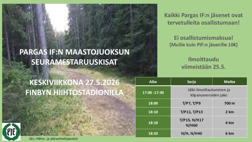 Yleisurheilujaosto ja hiihtojaosto järjestävät yhdessä Pargas IF:n seuramestaruuskilpailut maastojuoksussa keskiviikkona 27. toukokuuta. Lähtö on Finbyn hiihtostadionilta klo 18.00.